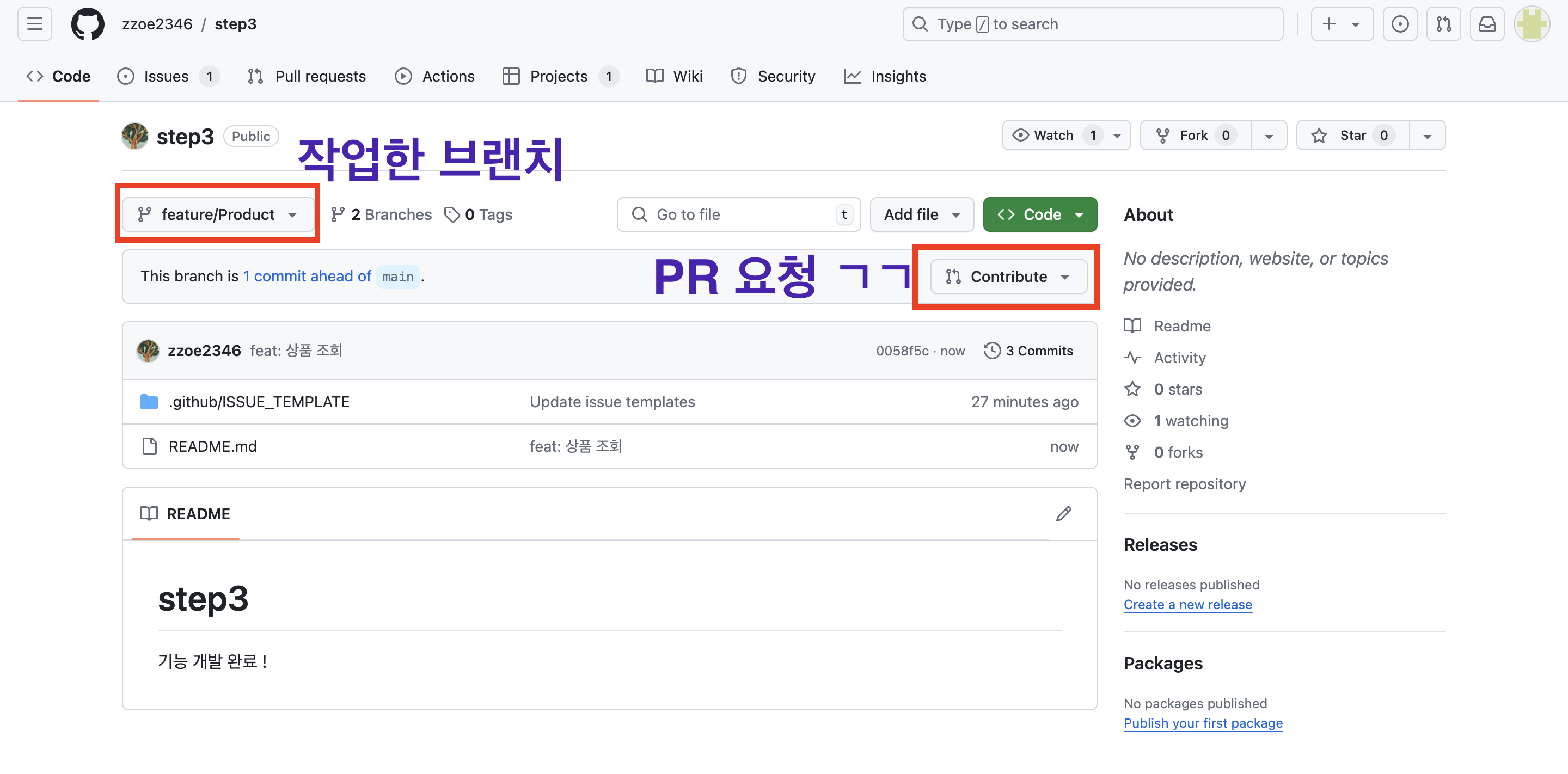 아래와 같이 브랜치가 변경된거 확인! 이제 코딩하면 됩니다.